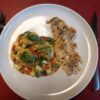 - Etwas Olivenöl in einer weiteren Pfanne vorheizen und den Fisch von beiden Seiten kurz anbraten. Das Basilikum zu der Gemüse-Knödel-Pfanne geben.