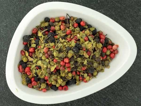 Diese aromatische Pfeffer Mischung kann man zu einer Vielzahl von Gerichten geben. Um das ganze Aroma zu nutzen, sollte diese Mischung nicht mitgekocht werden sondern erst auf das fertige Gericht – frisch zerkleinert – werden und dann genießen!